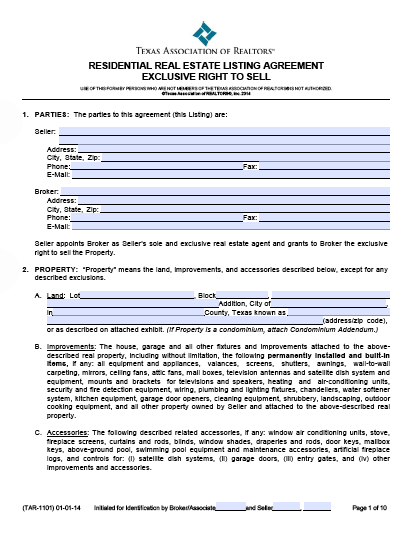 TAR 1101 Residential Real Estate Listing Agreement Exclusive Right to Sell is designed for listings for the sale of 1-4