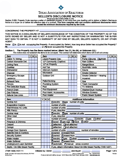 Section 5.008, Property Code requires a seller of residential property of not more than one dwelling unit to deliver a Seller’s Disclosure