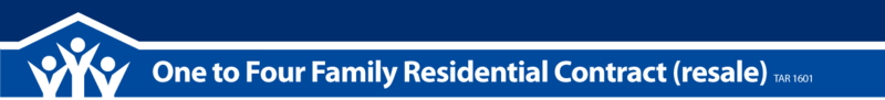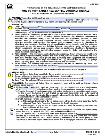 One to Four Family Residential Contract (resale) TAR 1601 Download this PDF for the One to Four Family Residential Contract (resale) TAR 1601 TAR 1601-ONE TO FOUR FAMILY RESIDENTIAL [...] Adobe Acrobat document [179.2 KB]